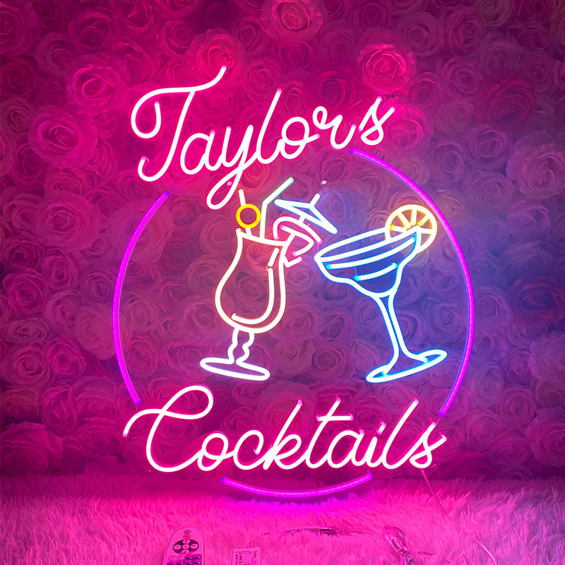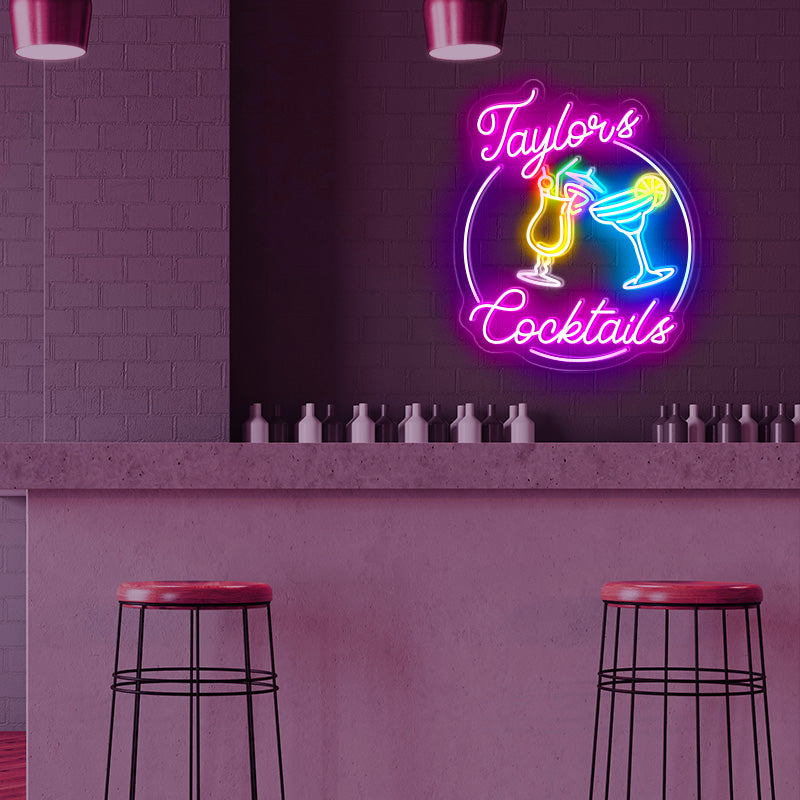 You can customize a neon drinks sign to provide various distinct ambiances. A simple cocktail bar sign in pink cursive may transform a posh cocktail bar with soft velvet furnishings, jewel tones, and brass accents into a Hollywood Regency-inspired establishment.