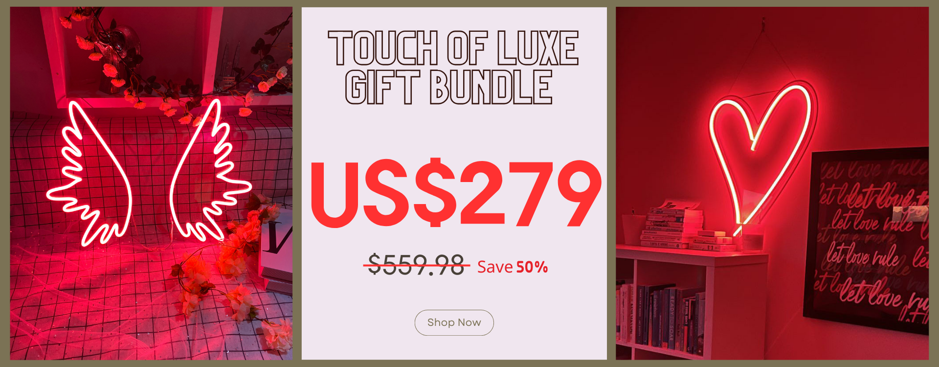 Introducing our Touch of Luxe Gift Bundle, a meticulously curated two-piece set designed to provide a nurturing and pampering experience. This impressive bundle includes our best-selling 50cm A Little Love Neon Heart and the gorgeously indulgent 50cm Angel Wings Neon Sign. Whether you're treating yourself or surprising a loved one, this stunning set promises to evoke beauty and joy in every moment.