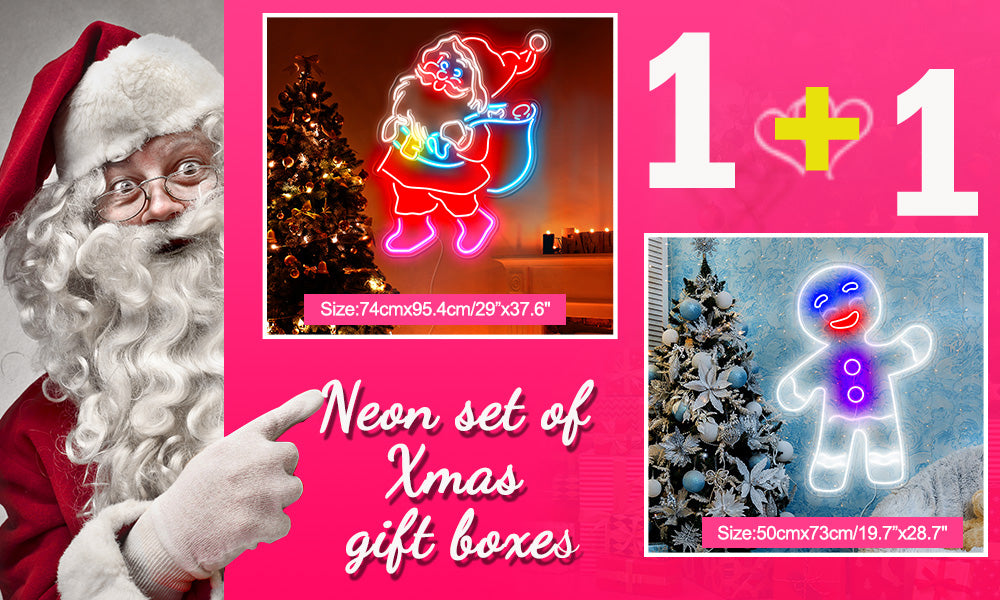 Our Christmas special 1+1 bundle deal gift box of two cute neon decoration lights is on special sale now! This gift box contains one Santa Claus with the gift bag Christmas neon light decor & Gingerbread Man neon sign for Xmas family or friends' present  installation accessories, and a dimmer. This gift box set is worth $1088! However, we have 50% off for this gift box set! Highly recommended!