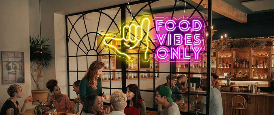 Customize a LED neon sign for your restaurant just like this"Food vibes only Neon lights" and it will bring you more people because cute neon lights can make people irresistible to take a picture and then share it on their social media, it can bring a lot of traffic to your business, customize your brand neon sign now.