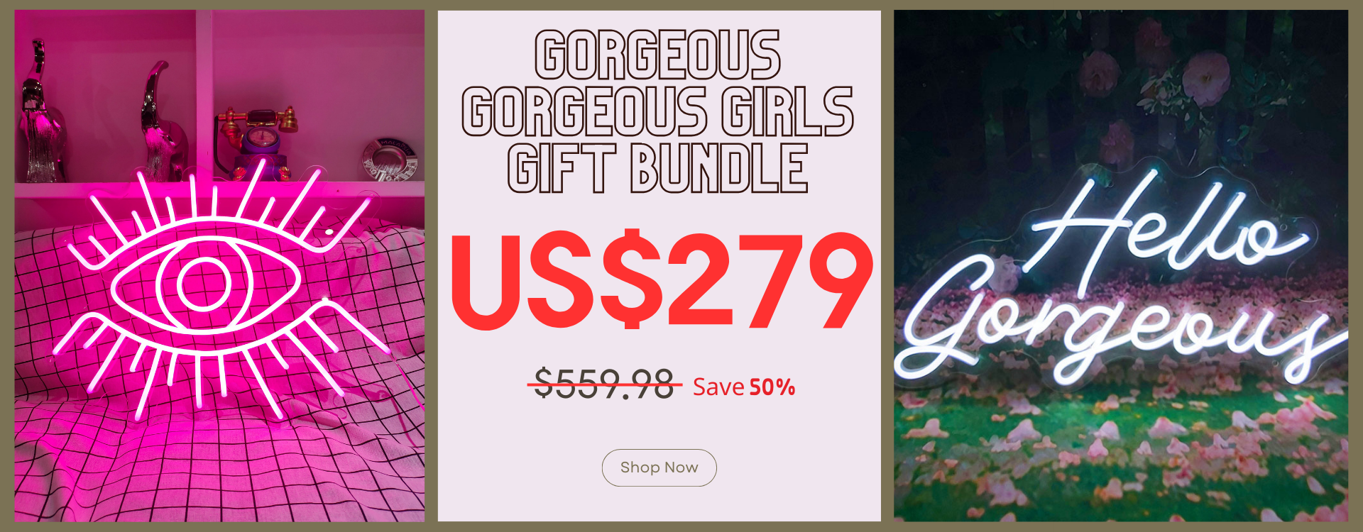 Introducing our Gorgeous Gorgeous Girls Gift Bundle, the ultimate gift to add glamor and inspiration to any space! This empowering set includes two captivating 50cm width neon signs that will enchant the recipient and elevate their surroundings with confidence and style. The Eye LED Neon Sign emits a mesmerizing glow, while the Hello Gorgeous Neon Sign greets them with positivity each day.