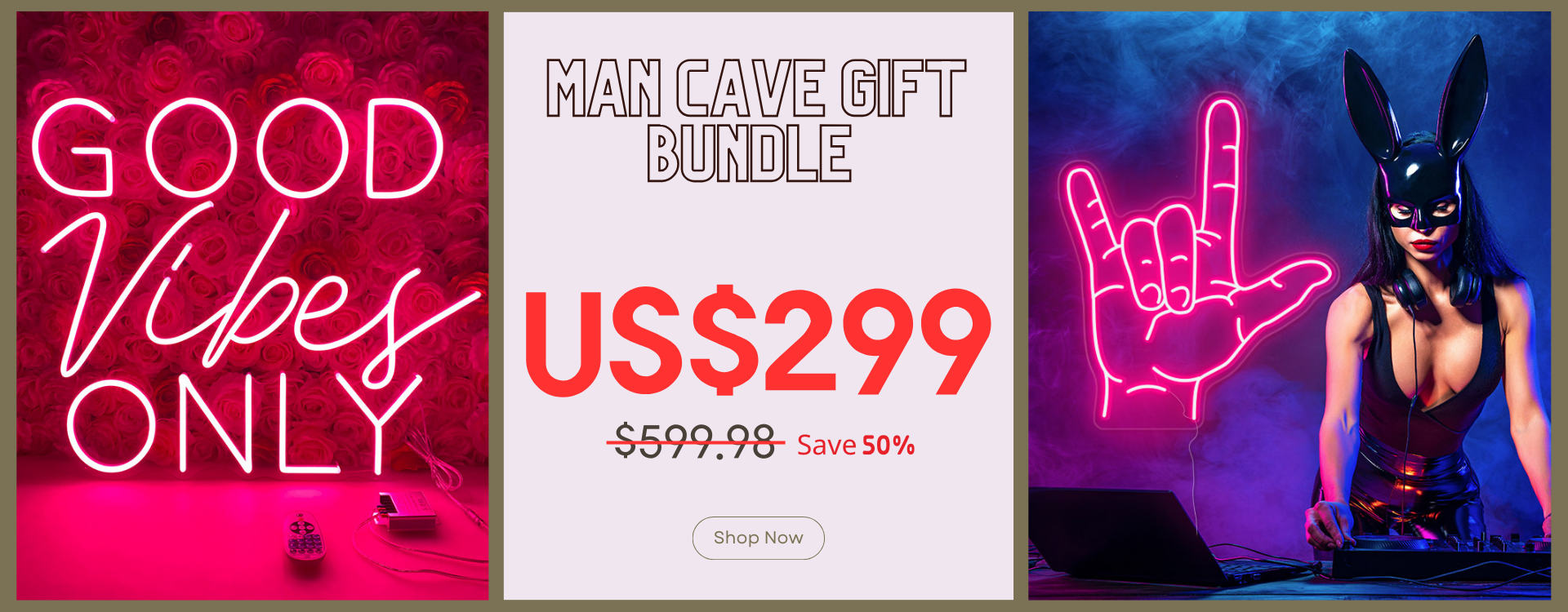 Introducing our Man Cave Gift Bundle: the perfect combination to turn any man cave into an electrifying haven. This exclusive bundle features two of our most iconic 50cm neon signs: the Good Vibes Only Neon Sign and the Rock n Roll Hand Neon Sign. Crafted with a man cave aesthetic in mind, this dynamic duo will effortlessly upgrade the ambiance, leaving every guy envious of their vibrant and energetic sanctuary.