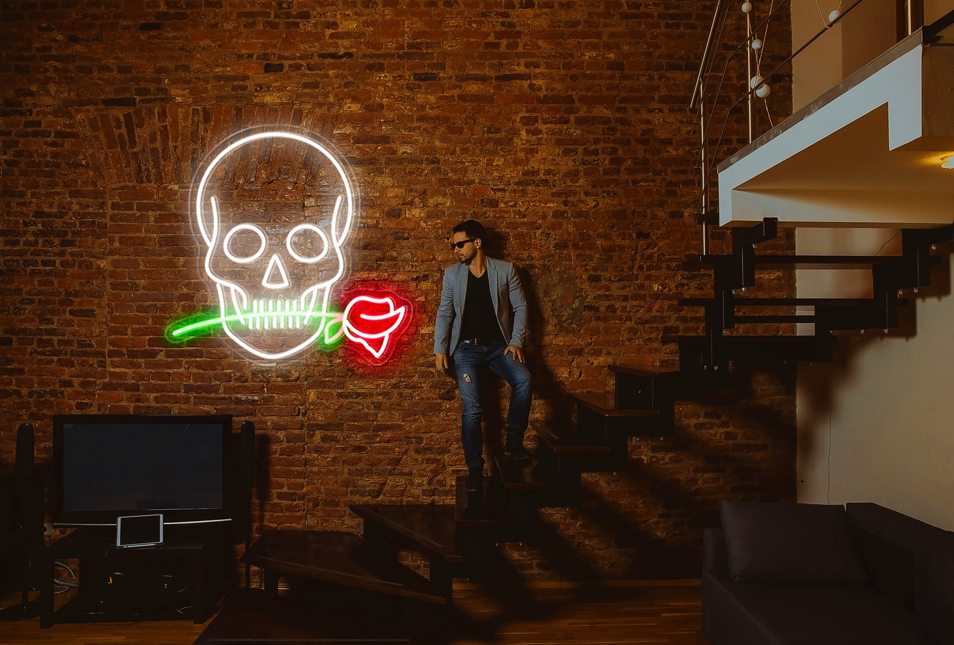 Add a unique and alternative touch to your home decor with our Skull and Rose Neon Sign. It's mysterious and cool design will surely catch everyone's eye. Perfect for Halloween decorations and customizable to fit your style.