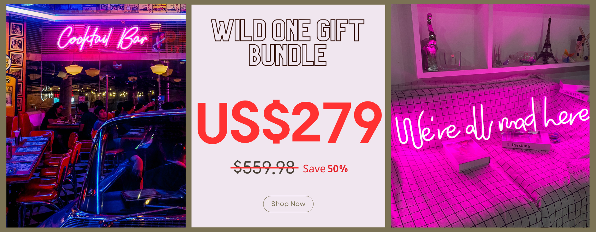 Introducing our remarkable Wild One Gift Bundle, featuring two captivating 75cm neon signs that will transport you to a world of enchantment. The Cocktail Bar Neon Sign sets a glamorous ambiance for gatherings, while the We're All Mad Here Neon Sign inspires curiosity and imaginative adventures. Infuse your space with wonder, joy, and creativity with this extraordinary bundle.