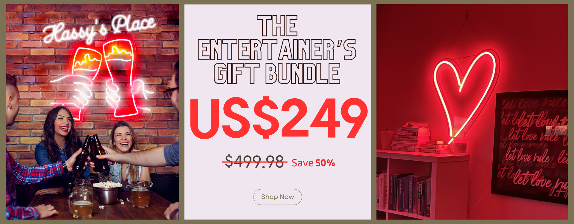 Introducing our delightful Entertainer's Gift Bundle, crafted to bring style and charm to any setting. This irresistible collection boasts a magnificent 50cm Custom Text and Drinks Neon Bar Sign, guaranteed to add a touch of elegance to your home bar or entertainment area. Furthermore, the bundle showcases a delightful 50cm A Little Love Neon Heart, infusing the space with an extra dose of warmth and affection.